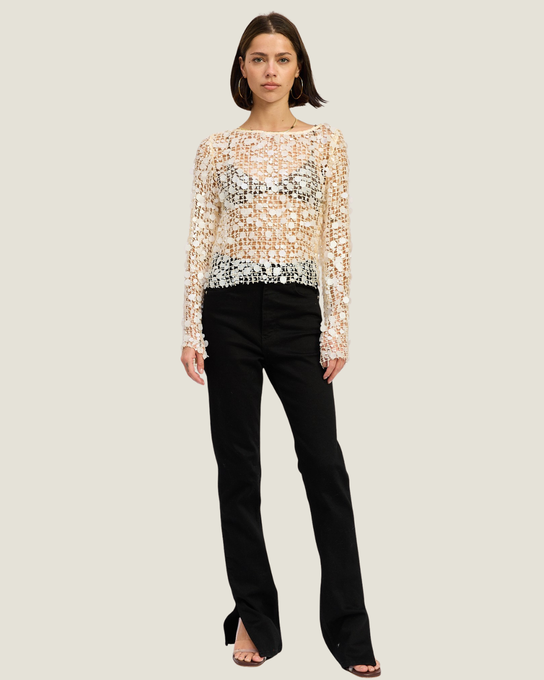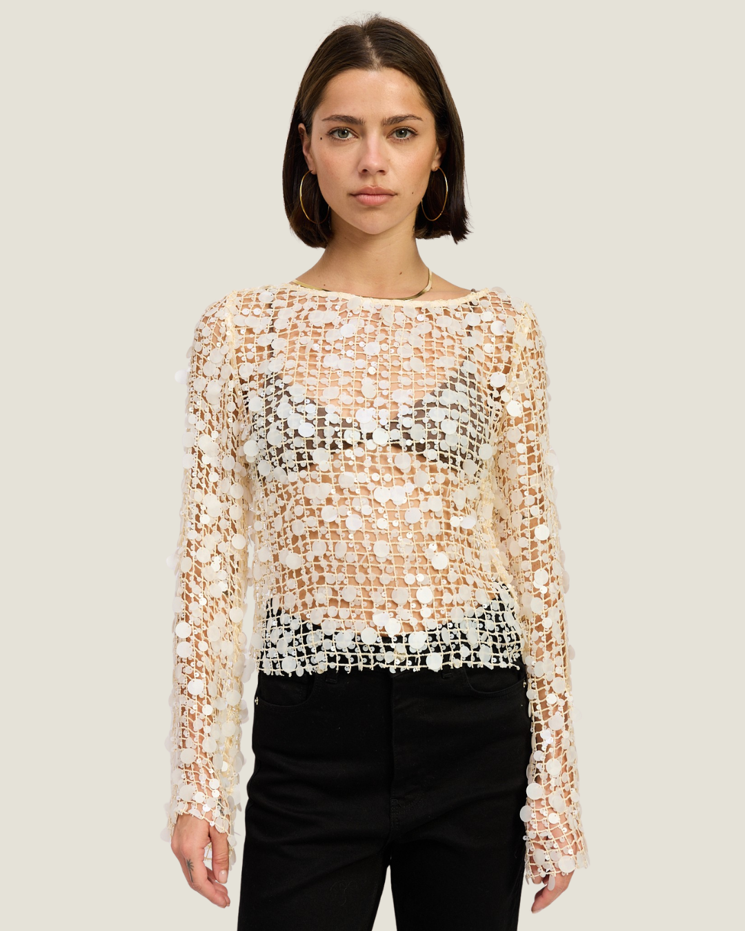 Sabrina Fishnet Sequin Long Sleeve Ivory Top