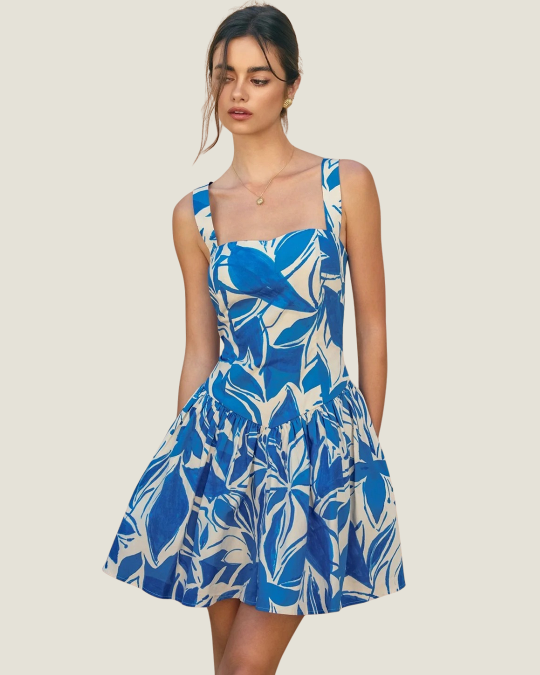 Cebera Short Sleeve Linen Print Mini Dress With Braid Tie