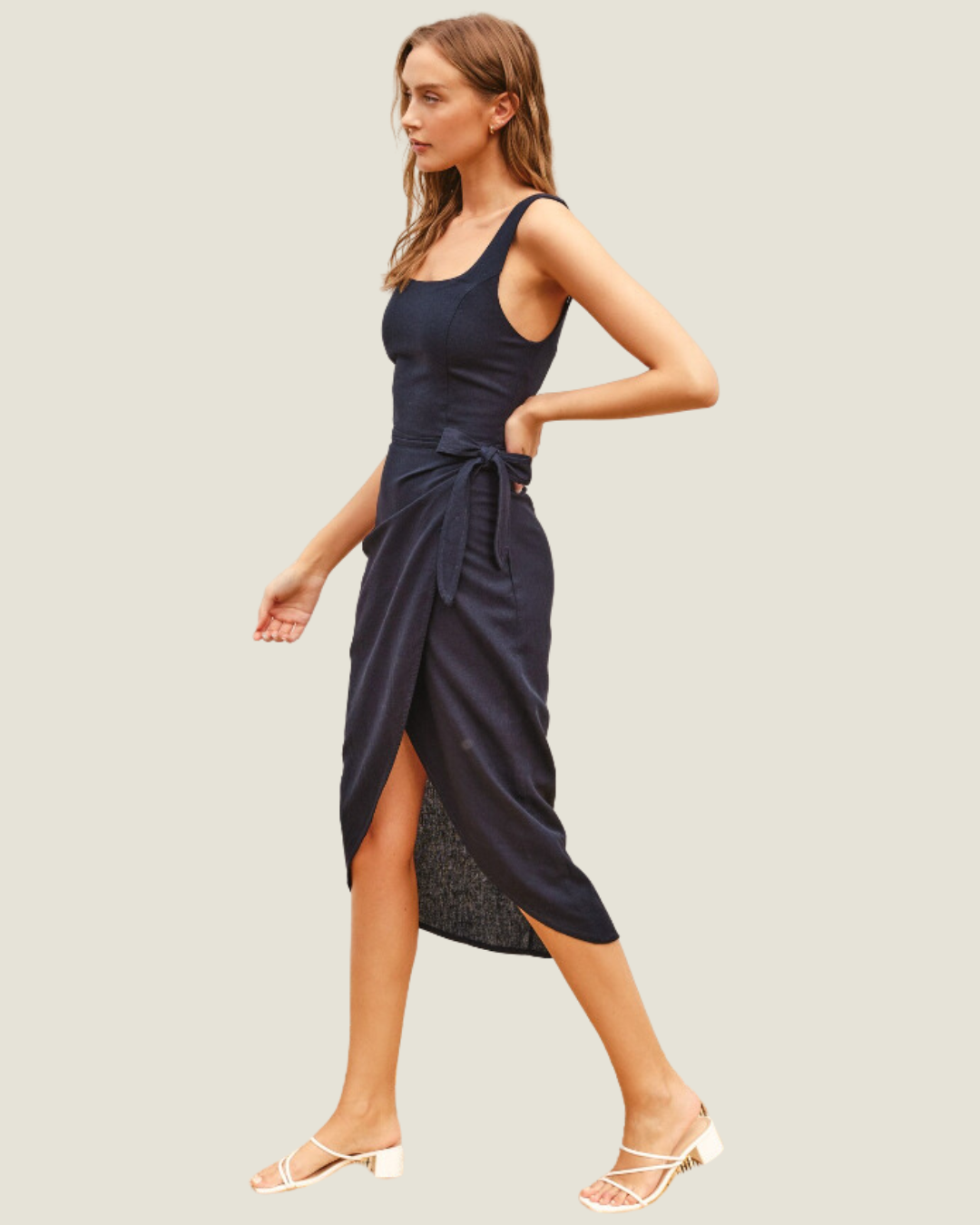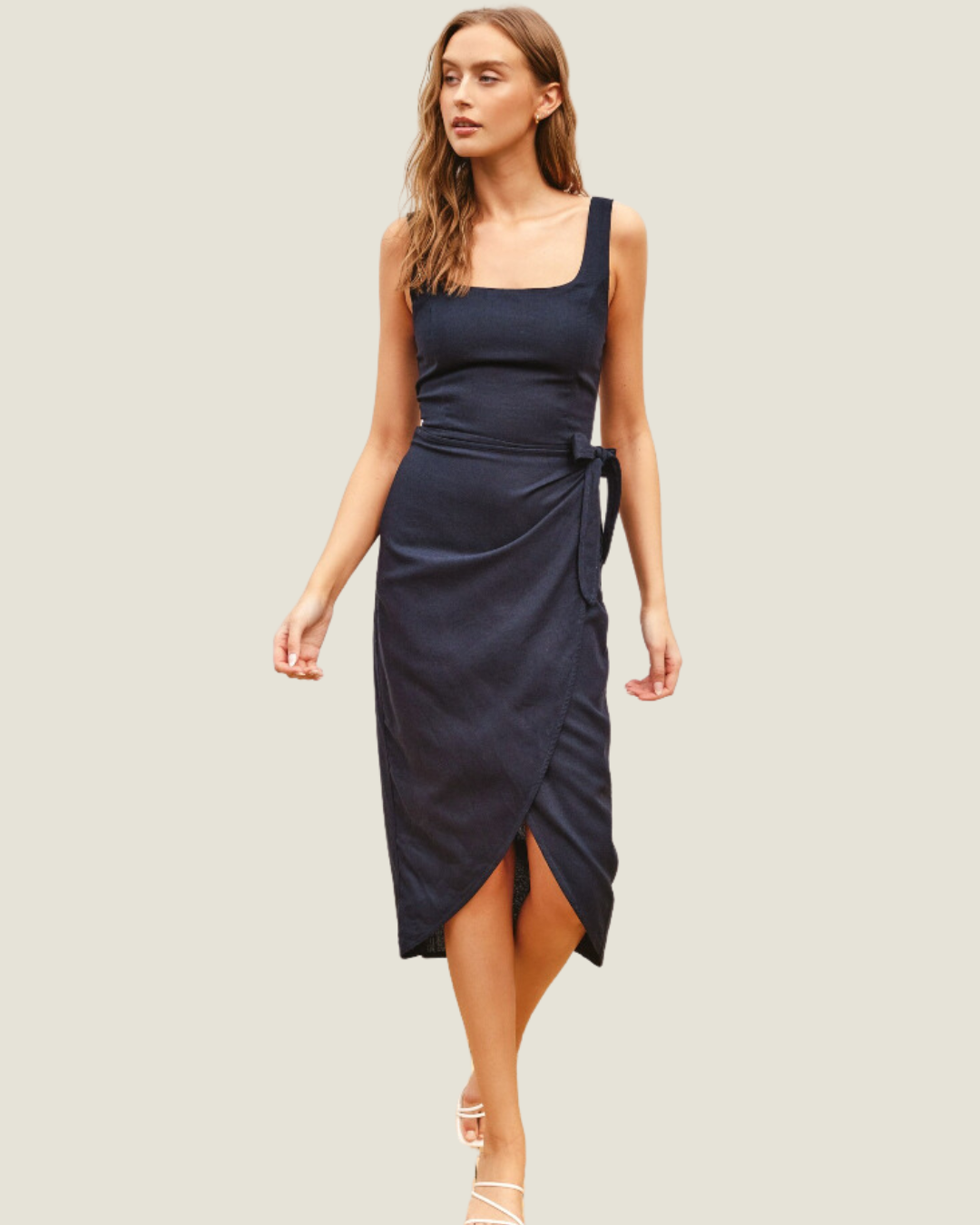 The Kat: Navy Linen Blend Wrap Midi Dress