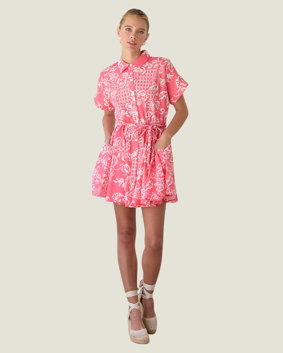Cebera Short Sleeve Linen Print Mini Dress With Braid Tie